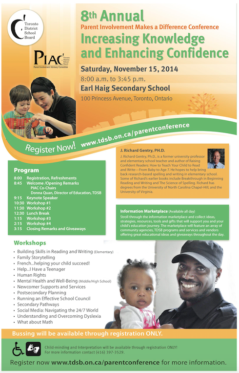 The TDSB’s annual ‘Parent Involvement Makes a Difference Conference‘ is an excellent opportunity to learn more about supporting your child and supporting your school. It takes place next Saturday, November 15th.
