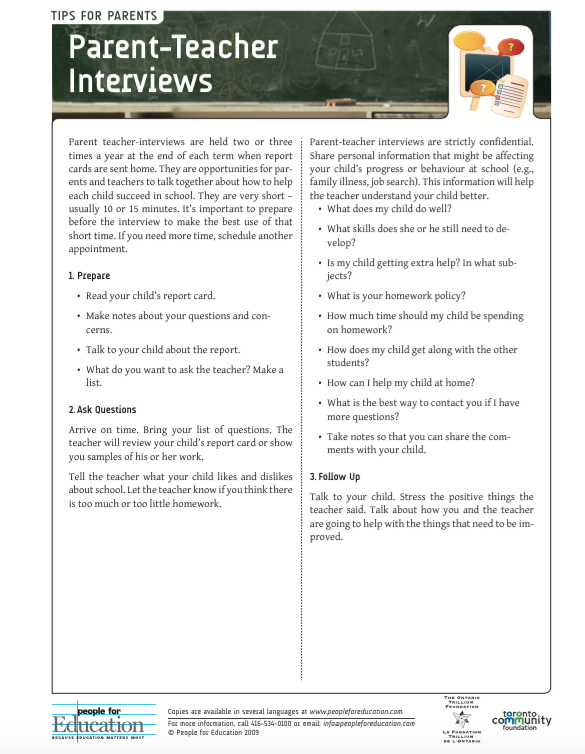 As interviews continue this week, many will have their child’s progress report interview this evening or Friday morning. This handy flyer, produced by People for Education, provides some guidelines for parents for getting the most out of your interview time.