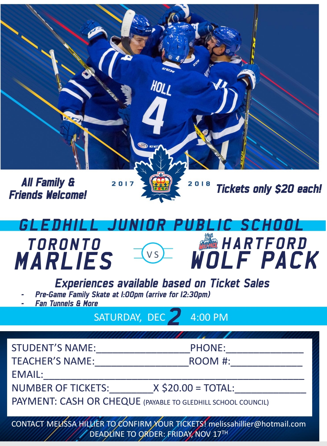 *TICKETS can be picked up in the office the week of November 27th 2017. If you choose to have your child pick up the tickets, Marlies will not be issuing replacement tickets if tickets are lost.