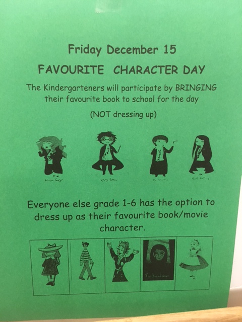 - SPIRIT Day – “Favourite Character Day” The Kindergarteners will participate by BRINGING their favourite book to school for the day. Everyone else in grades 1-6 has the option to dress up as their favourite book/movie character.