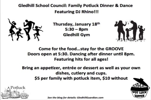 Family Potluck Dinner and Dance is this Thursday, Jan 18th (and Friday is a PA Day)
