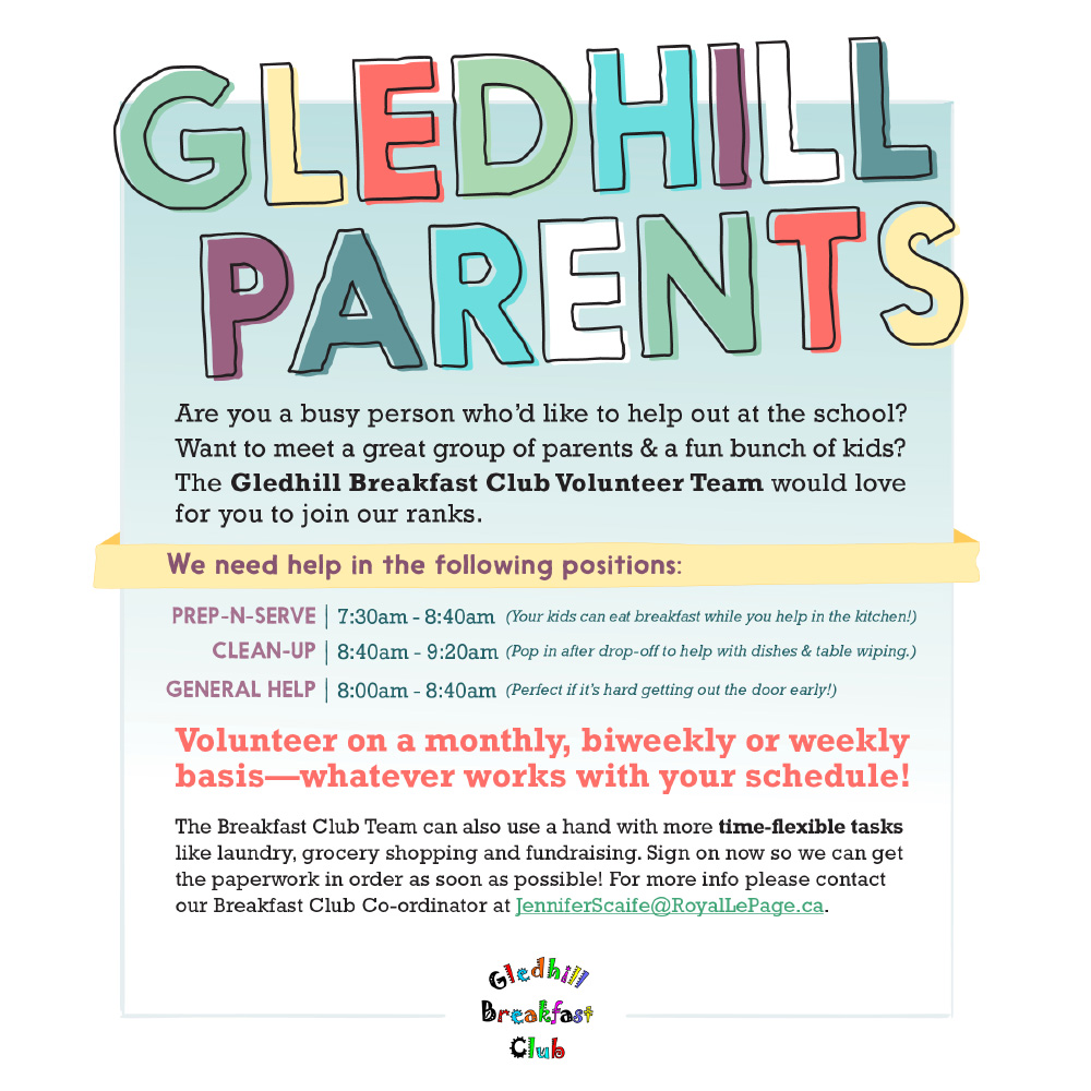 So many great things are happening at our school! The School Council would like to introduce a new series of posts we are calling “Spotlight On:” They are designed to introduce new and old parents alike to the programs and events going on and in some cases, how we as parents, can get involved. The first of our series is on The Gledhill Breakfast Club!