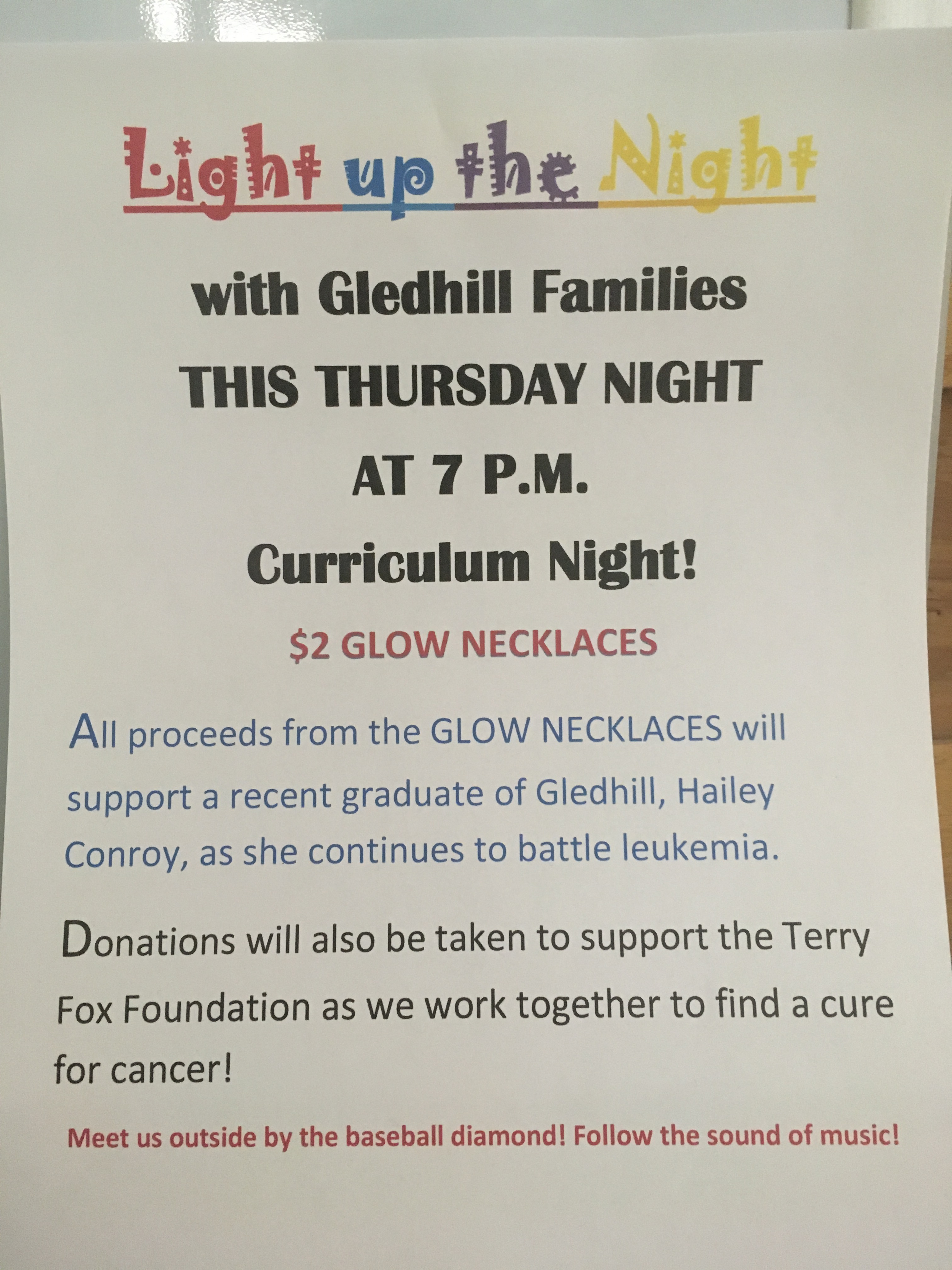 - 7-7:30pm “Light up the Night” Family Walk in the school yard (see details on poster below)