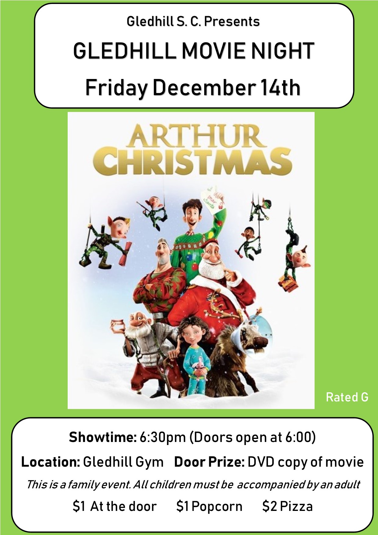 - Friday, December 14th – Family Movie Night -“Arthur Christmas”