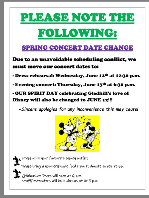 Note: These announcements are typed up daily and posted by a parent volunteer on the Gledhill School Council’s Communications Committee. Edits or omissions are made occasionally to protect the privacy of student identities.