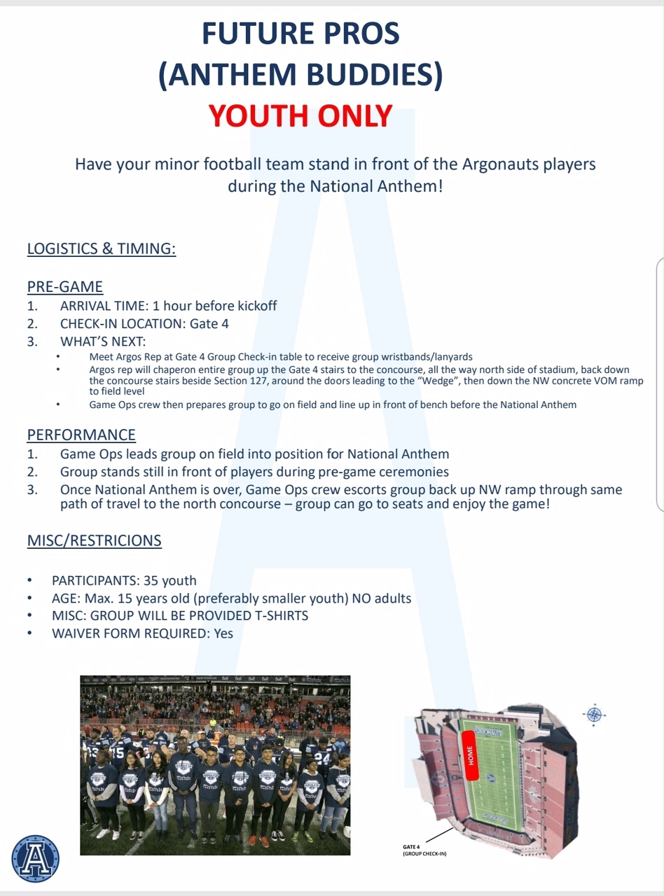 Children going to Gledhill Goes to the Argos this Saturday have been given a super cool opportunity to be on the field with the Argos during the national anthem!!!