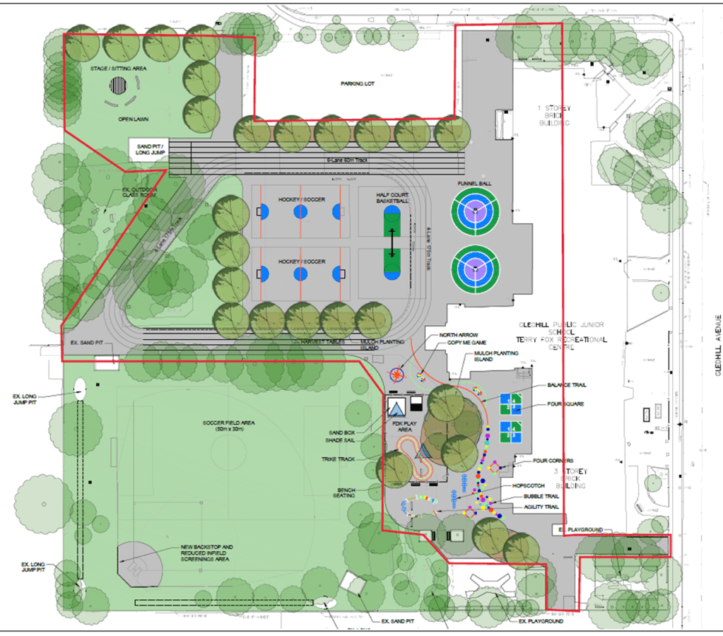In consultation with the Board, the Ministry of Education, our Parent Council co-chairs, teachers and administration from Gledhill, a design has been finalized that will completely update the yard. The design plan as it is now is attached to this communication. It features a re-design of current elements that the school has, but allows for better flow and opportunity for play for our kids. The design includes more sitting areas, an additional outdoor classroom/stage feature, changes in location of current hockey and basketball nets, a proper soccer field and baseball diamond and a better situated kindergarten play area. In addition to those, this plan also accounts for a better drainage system for the rear yard. This will hopefully alleviate the ice and slush that many of our walkways tend to accumulate. At this time, the general timeline is for this to begin in Summer 2023 and be completed towards the end of this calendar year. As we all know, construction projects tend to have a more fluid timeline than other things and we will communicate any adjusted timeline to the best of our ability.