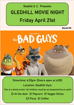 Join us on Friday April 21 for Family Movie Night, we’ll be watching The Bad Guys. Doors open at 6:00pm, Showtime is 6:30pm. Cash only event.