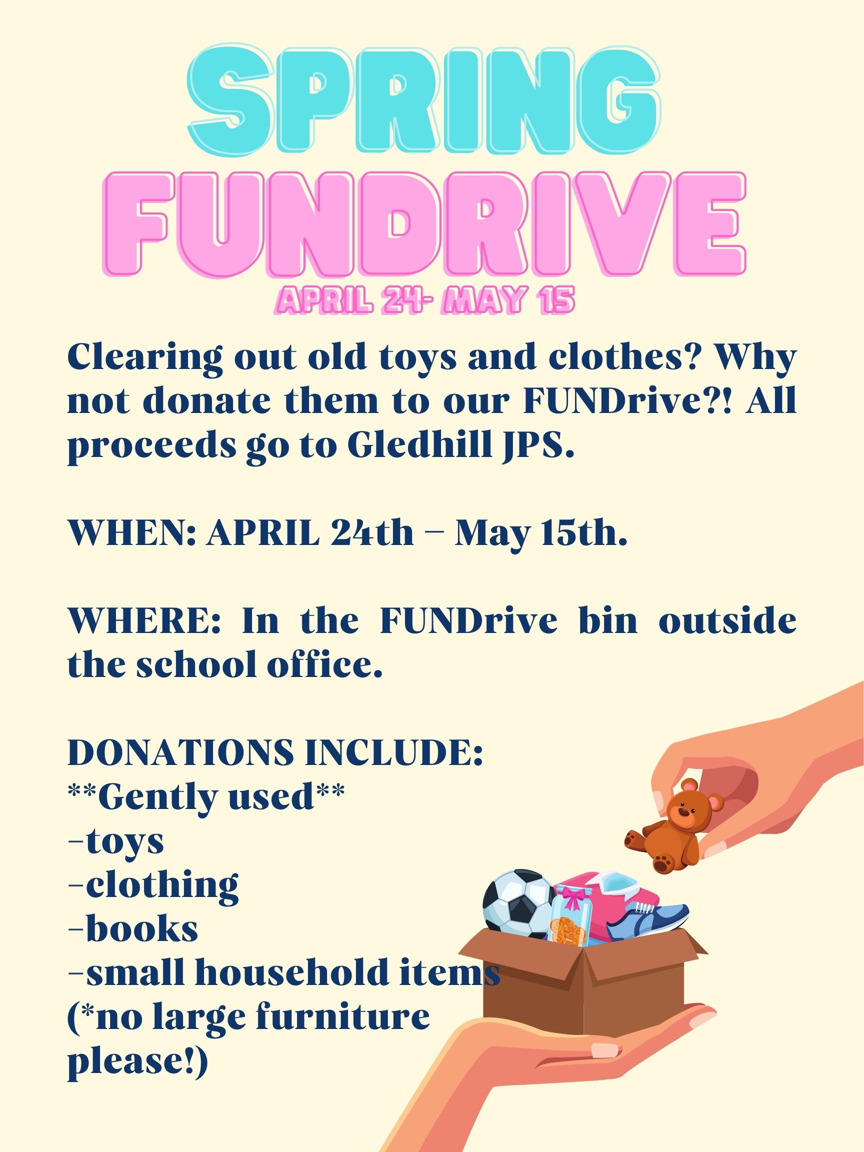 From April 24 until May 14, bring in your old toys, clothes, books or small household items to help raise money for Gledhill. Details below.