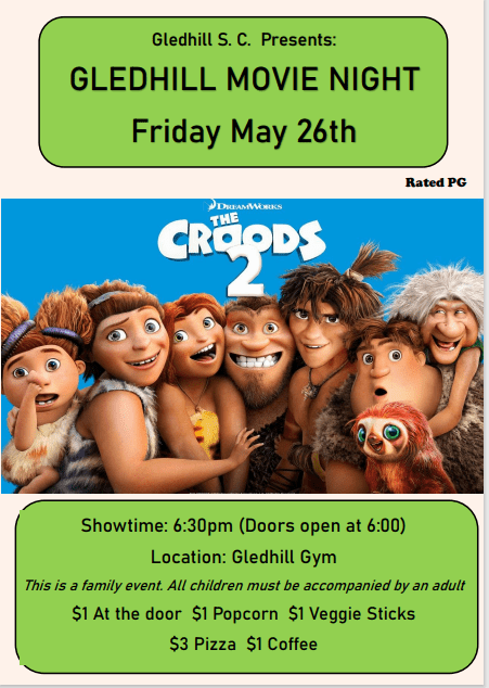Join us on Friday May 26th for Family Movie Night, we’ll be watching The Croods 2. Doors open at 6:00pm, Showtime is 6:30pm. Cash only event.