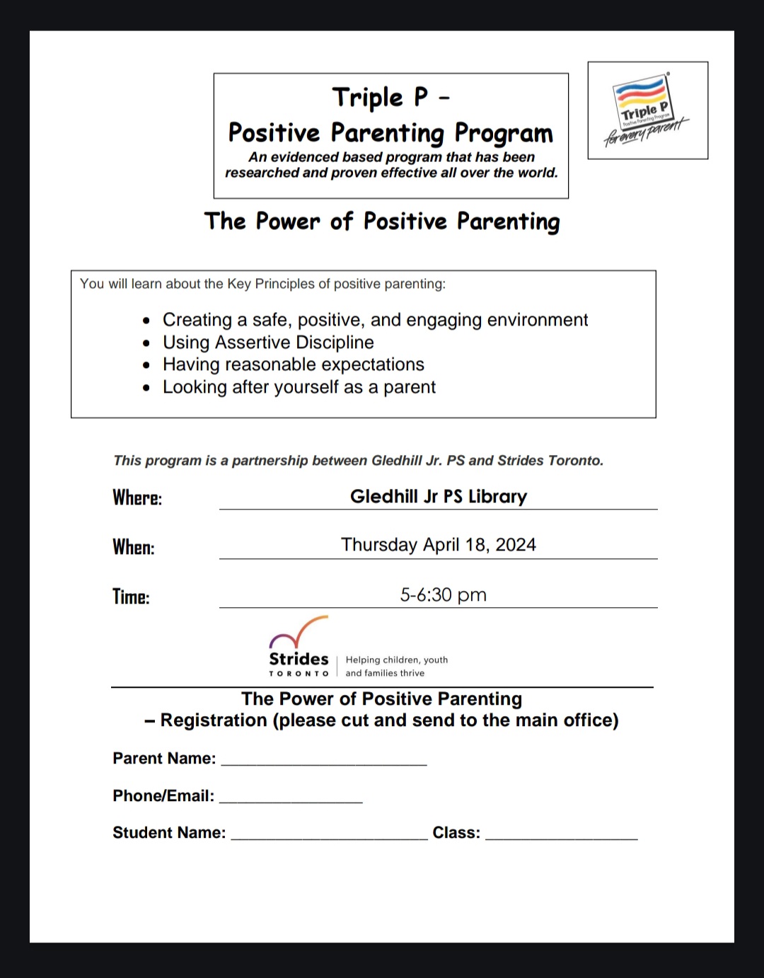 We are proud to announce that a parent workshop called “Triple P – Positive Parenting Program” has been arranged for Thursday, April 18th from 5:00-6:30pm. There will be childminding available for those interested.