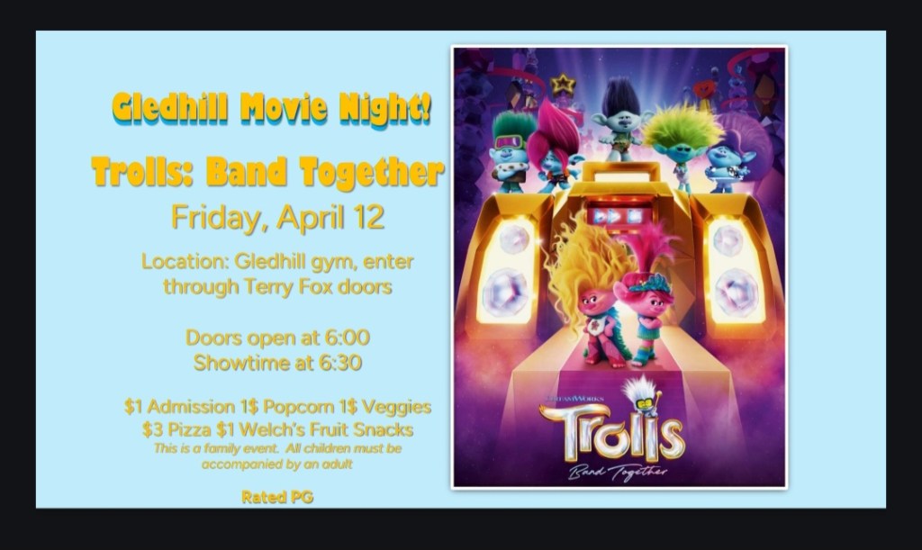 Our next movie night is coming up quick, we will be screening Trolls: Band Together (Rated PG).