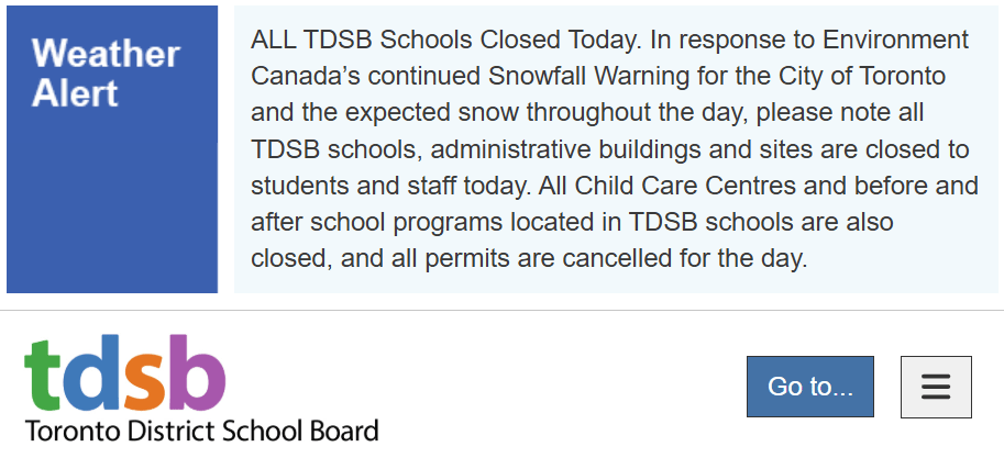 Schools are closed today due to inclement Weather. As a reminder, schools are also closed tomorrow (Jan 16) as it’s a scheduled PA day. We will see you on Monday!