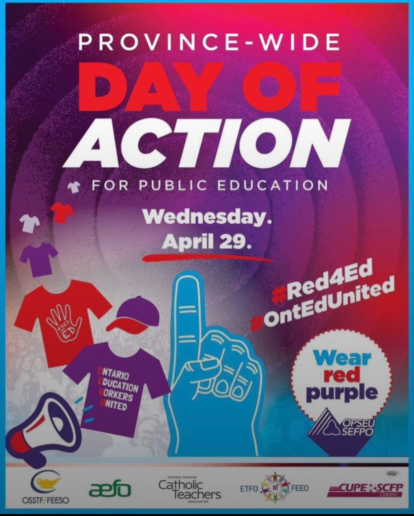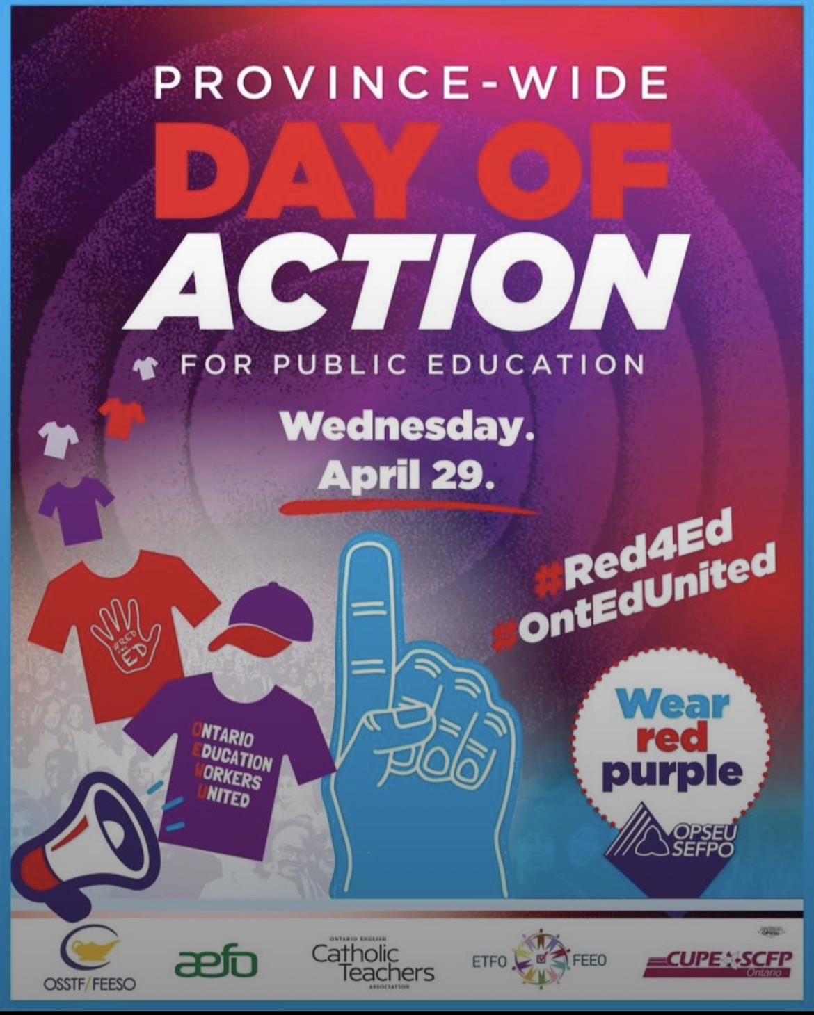ETFO is inviting the parent community to join our staff at the upcoming ETFO Day of Action (Walk In) and Red for Ed. on Wednesday morning, April 29th. Gledhill teaching staff will gather at the north- west corner of Danforth and Gledhill Ave intersection, around 8:15 am for approximately 15 to 20 minutes. All will walk into the school together. Everyone is encouraged to wear RED for Ed.
