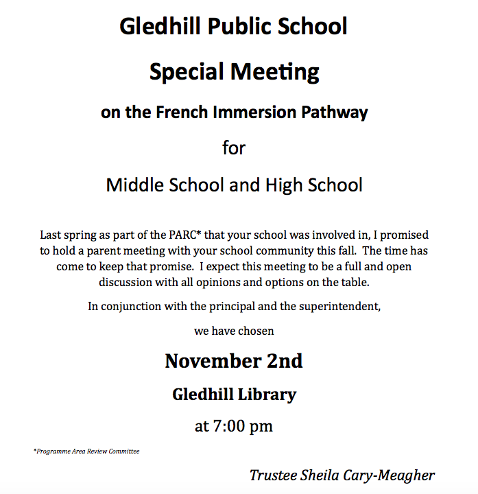 On Monday, November 2, our School Ward Trustee, Sheila Cary-Meagher, hosted an informal meeting in Gledhill’s school library to discuss the “French Immersion Pathway for Middle School and High School.”