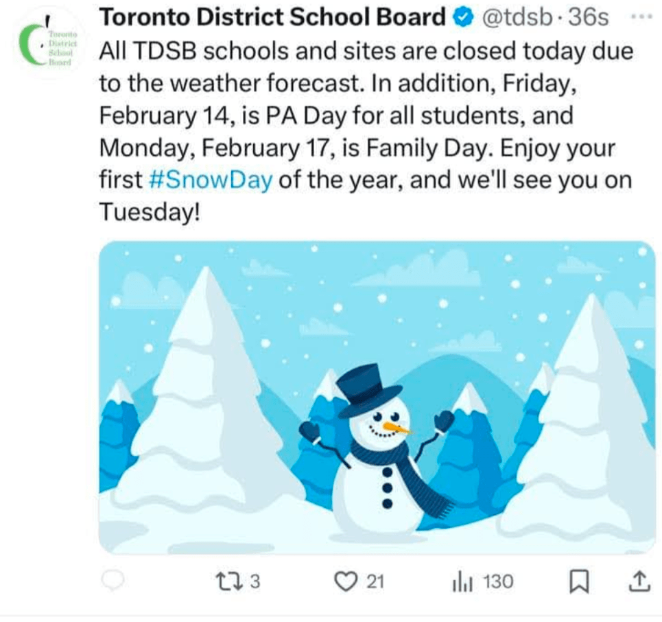 The TDSB has announced that today, Thursday Feb 13th, the school’s will be closed due to the weather.